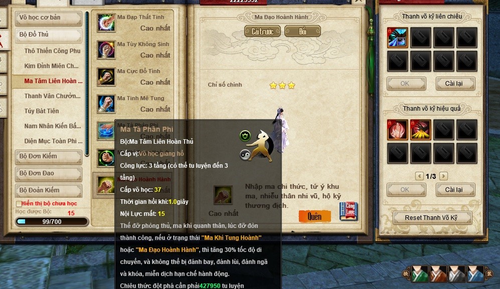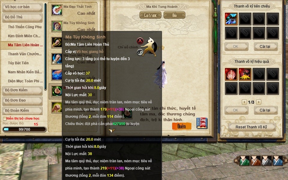 Đầu tiên là Ma Khí Tung Hoành, rút máu địch… và cả ta, xài không hợp lý thì tự ngỏm :D ... Nhưng khi bật lên còn cả cấm khinh công nữa, nếu kéo địch ngã thành công lại phía mình bằng chiêu Ma Túy Không Sinh thì nhạn hành công vào rồi thồn hành cho địch rất ổn. Lý thuyết là thế :D trường hợp sida quá vẫn còn 1 chiêu nộ khi tích đủ rất khó chịu đó là Ma Đạo Hoành Hành, bật lên cái là miễn sát thương từ địch sau tích tụ lại và làm quả bom nổ, xài hợp lý rất hay trong quần công, địch xả chiêu ầm ầm xong ăn bom nổ lăn ra chết.